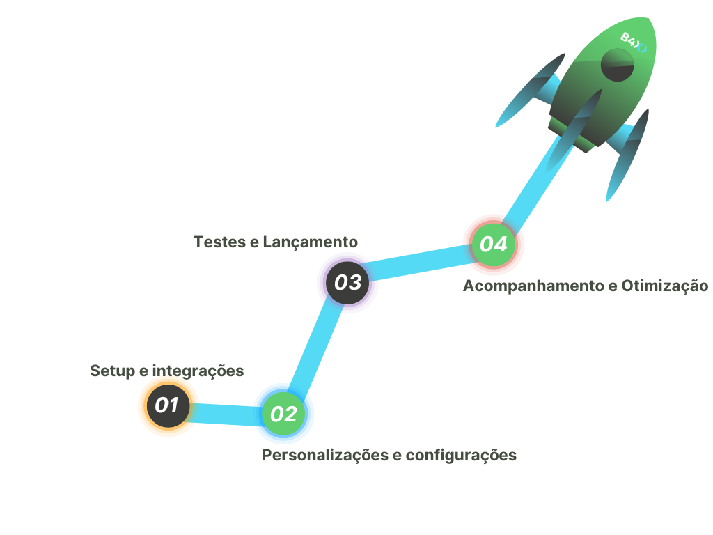 Uma jornada de sucesso para o seu e-commerce, realizando uma implantação completa em quatro etapas estratégicas e abrangentes. Ao seguir esse roteiro cuidadosamente planejado, você estará preparado para alcançar resultados excepcionais e se destacar no mercado online.